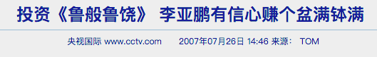 当时有一间北京的公司和李亚鹏合作,投了6000万进去,说要拿回1亿。