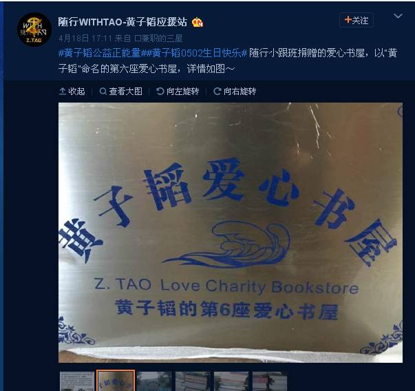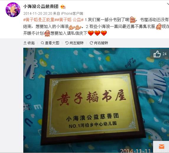 海浪们组建的‘黄子韬爱心书屋’已经在第六间贫困小学落地。
