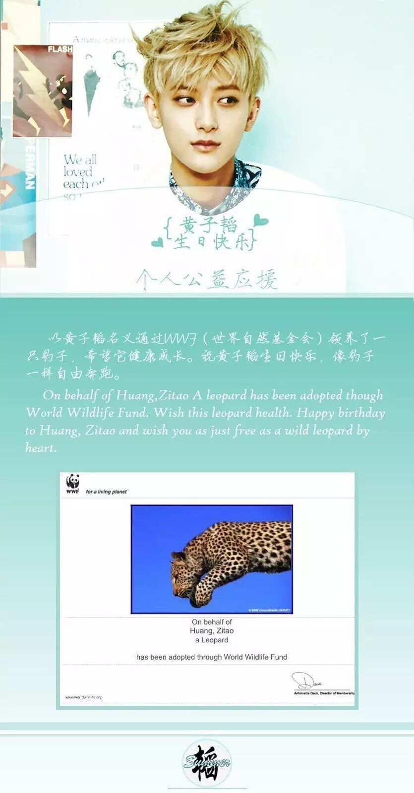 粉丝也以黄子韬名义通过世界自然基金会领养了一只豹子,以实际行动保护濒危动物。