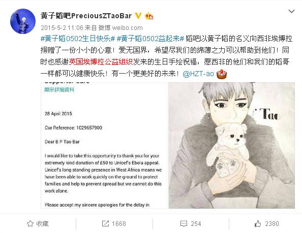 爱无国界,公益也无国界。海浪们向西非埃博拉进行捐款,并获得了英国埃博拉公益组织回赠的手绘黄子韬画像。
