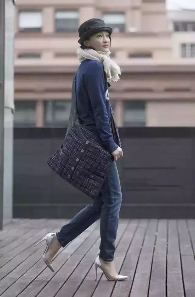 深蓝色的外套搭配宝蓝色的丝绒小背包,