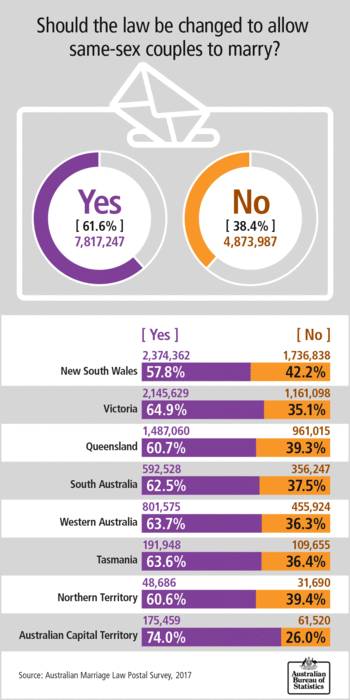 今年11月15日,公民投票结果正式公布:61.6%的选票投了Yes,38.4%的选票投了No。也就是说,大多数人选择支持同性婚姻。