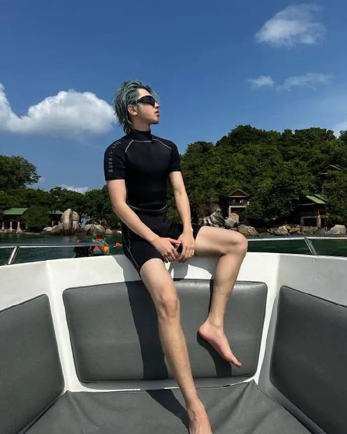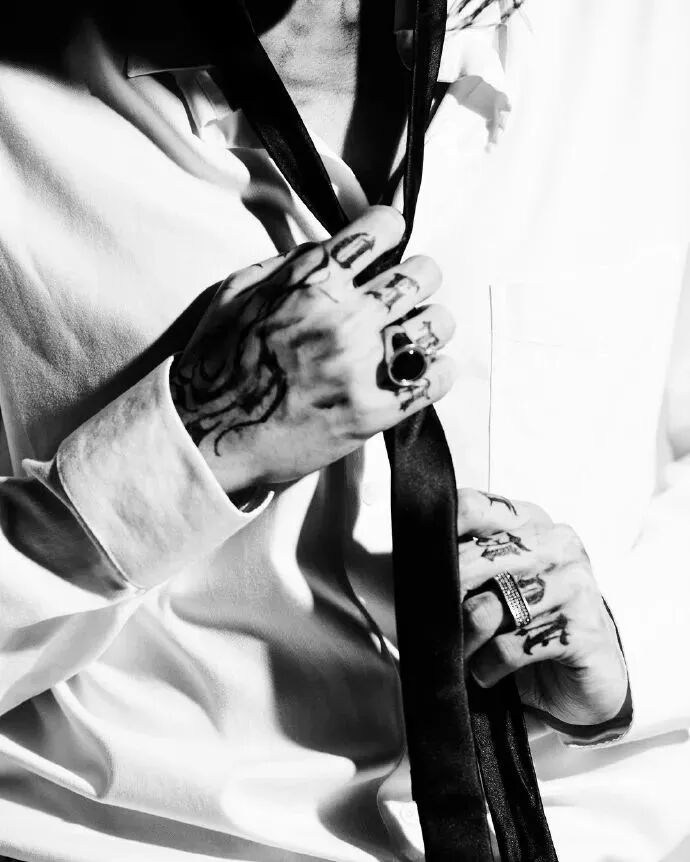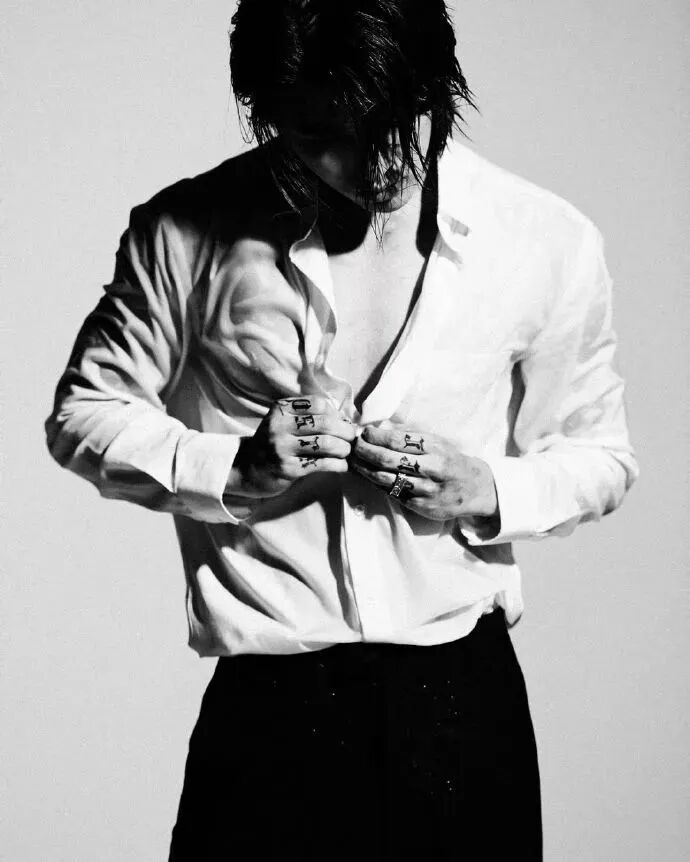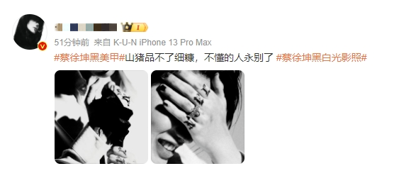 照片整体都是黑白色系。蔡徐坤甚至还染上了黑色美甲,左右手都刻上了英文字母。