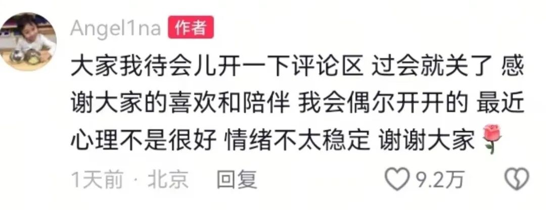 心情不好,她就会关闭评论区,并且公告大家“最近情绪不稳定”。