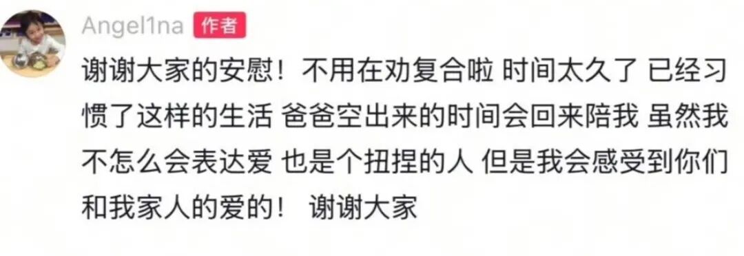 比如对一直希望她父母复婚的网友,她明确表示谢谢大家,不要再劝,“时间太久了,已经习惯了这样的生活。”