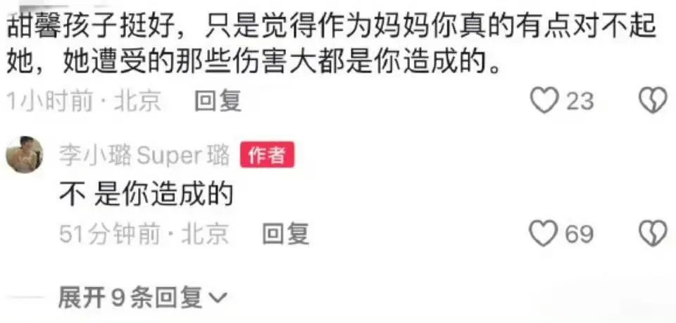她在自己的社交媒体上发与甜馨的生活日常,有网友教育她,说作为妈妈你对不起甜馨,“她遭受的那些伤害大都是你造成的”。