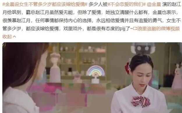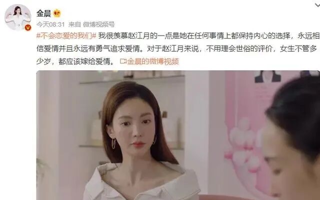 近日,金晨新剧《不会恋爱的我们》于某网络平台上开播,该剧讲述的是金晨所扮演的女霸总赵江月,因为长年累月的工作,最终变成了一个“爱无能”患者。