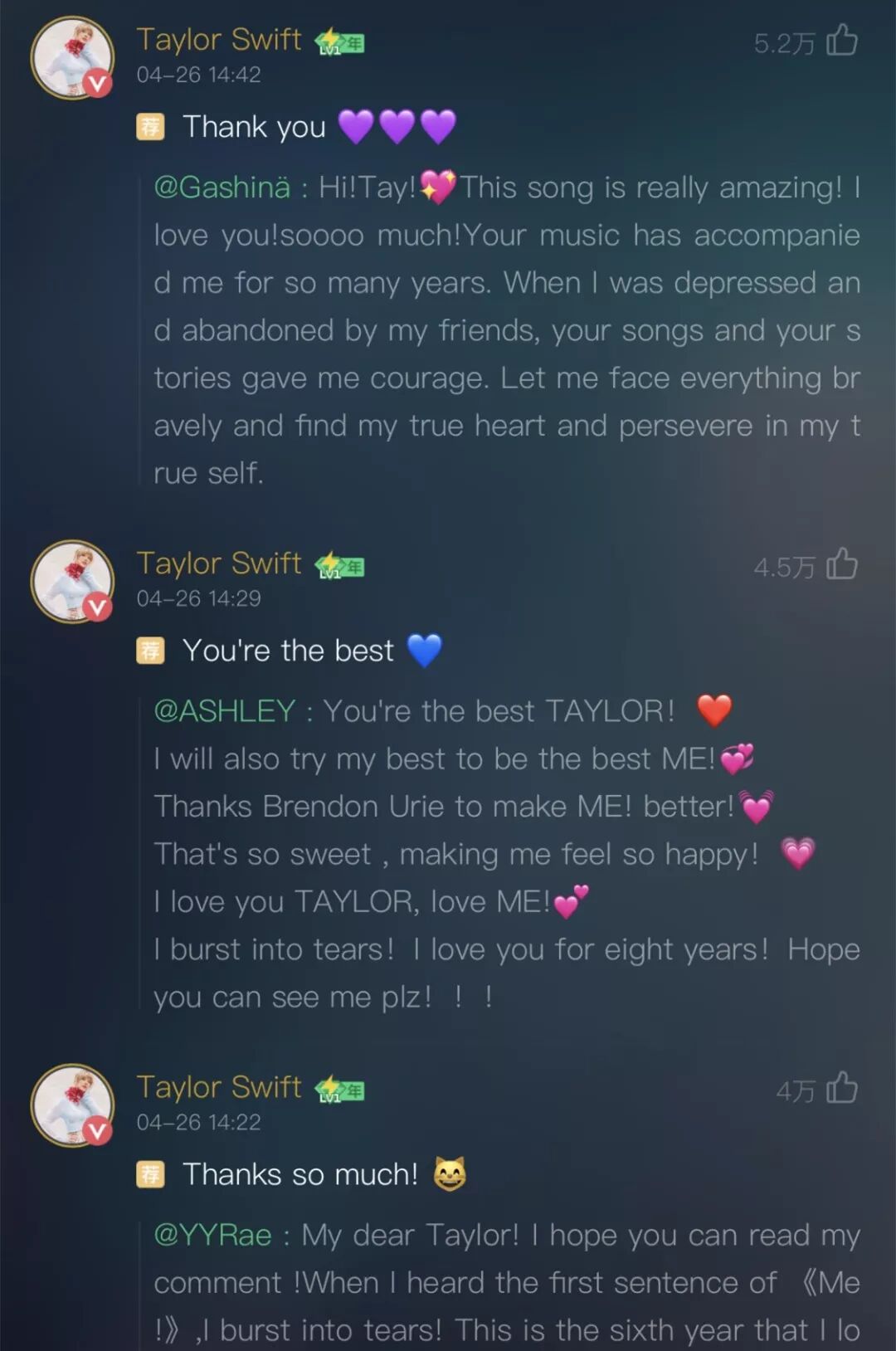 10、北京时间14:00,霉霉空降Q音评论区并翻了四位粉丝的牌,在此时段,QQ音乐评论数以每秒999+的速度更新。