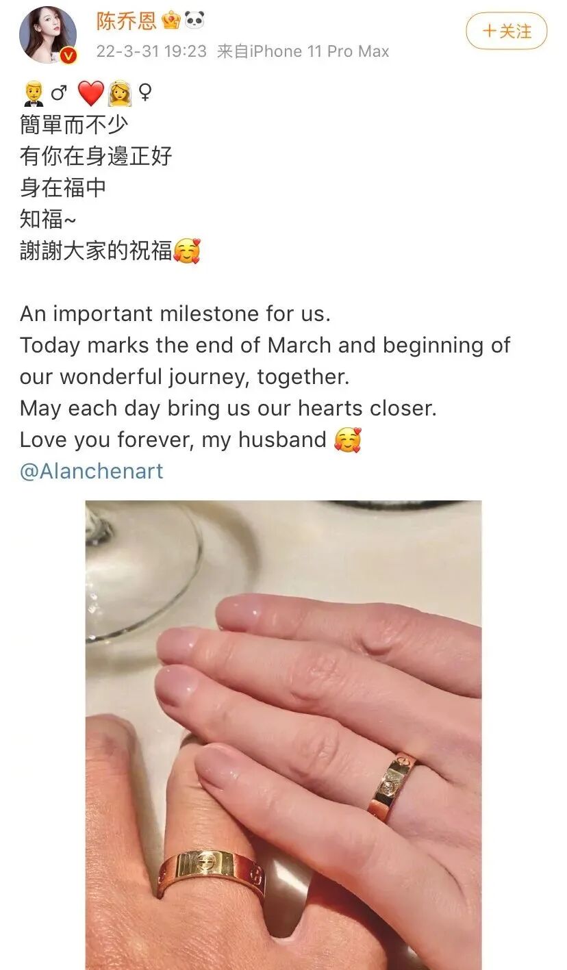 昨晚,她还特意晒出了对戒照片,感谢大家的祝福。