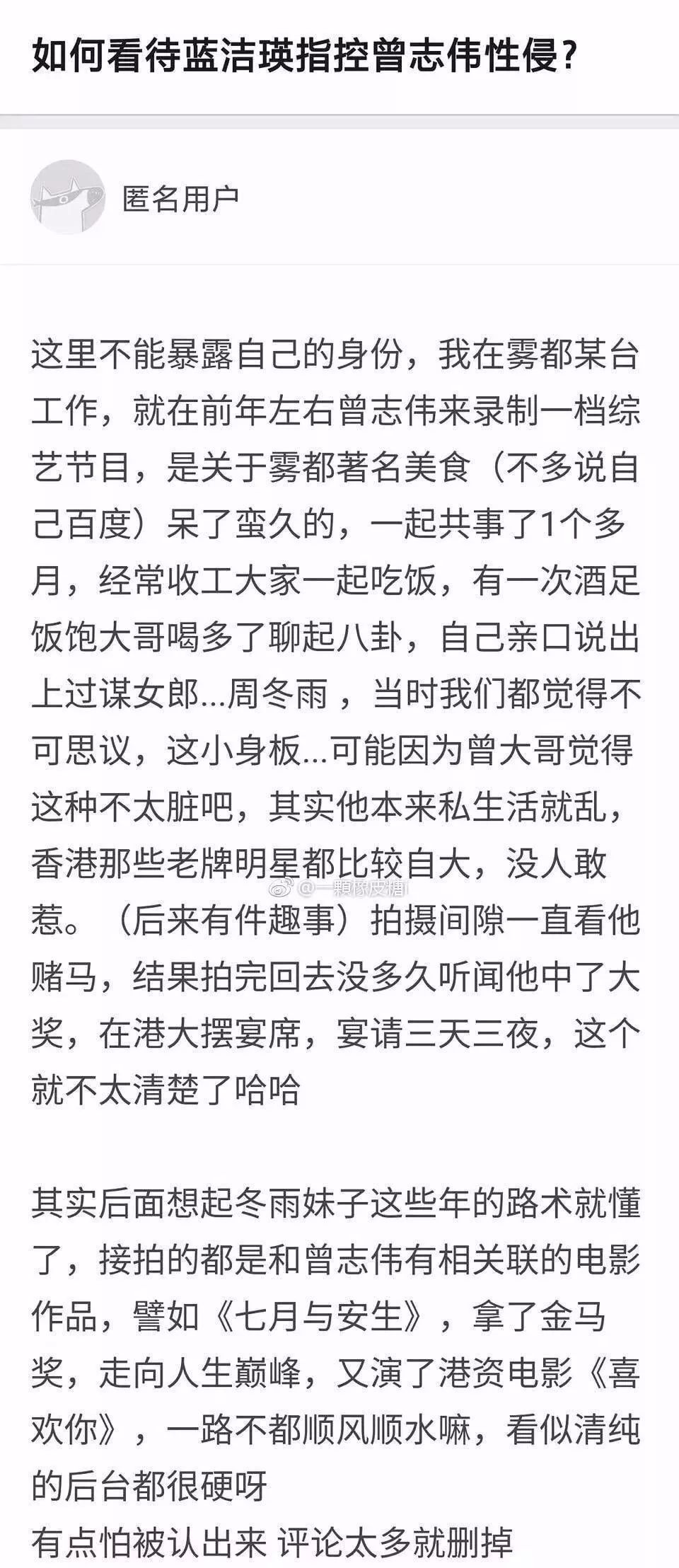 知乎上也有一位匿名用户称,周冬雨也曾经与曾志伟发生过不正当的关系,还把周冬雨这两年作品的导演、出品方都列出来,似乎更加证实了是曾志伟在背后的力量,让这个古灵精怪的谋女郎事业不断up。