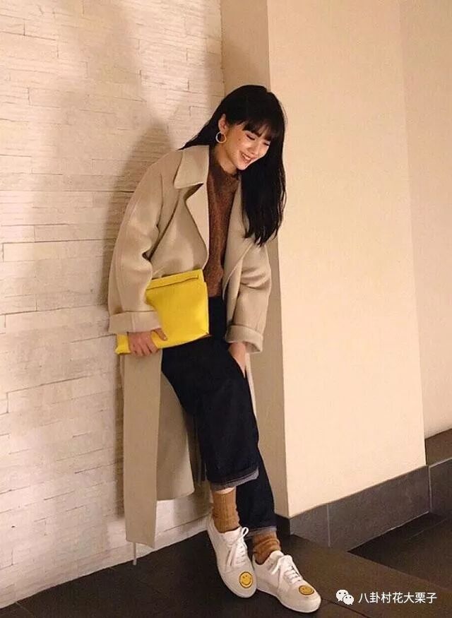 灰色的短款宽松毛衣搭配翻边阔腿牛仔裤,牛仔皮衣套在外面,脚上是一双白色的帆布鞋,休闲却又不乏质感的穿搭,将成熟和时尚双重锁住,而且配上这个无辜的表情,真的是很有故事感了!