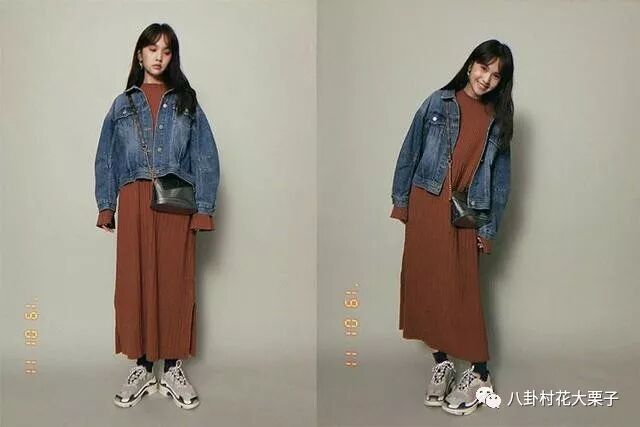 长款直筒的包脖针织连衣裙,两侧做了开叉设计,方便行动,配上短款的牛仔外套,显出腰线,同时能够让直筒的裙身看起来没那么膨胀,脚上用长筒袜加复古老爹鞋的组合很有休闲时尚feel,色彩还有层次感都很到位,真是又会唱歌又会穿搭,真是越来越优秀的杨丞琳!