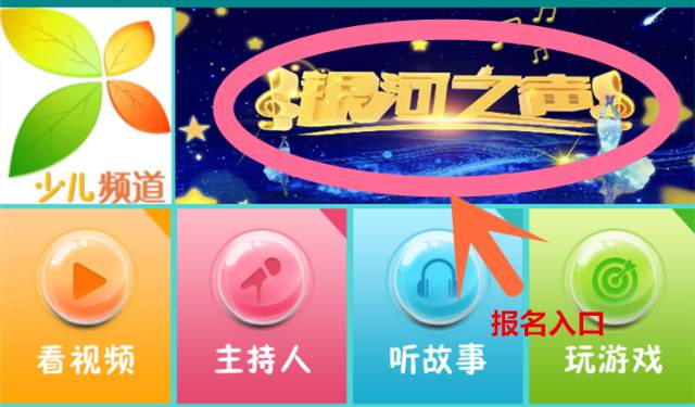 2.进入央视少儿客户端首页,点击右上方“银河之声”报名专区。