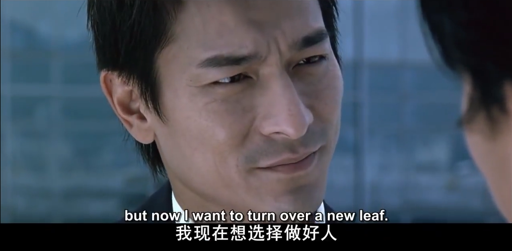 《无间道》里的天台对话,他说:“我以前没得选择,现在我想做一个好人。”