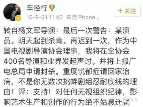 而杨文军的朋友车径行导演,去年曾经在微博不点名批评过乔任梁,并表示有忧郁症就回家治病,如果再迟到一次,将在全协会封杀他,还要上报到广电总局