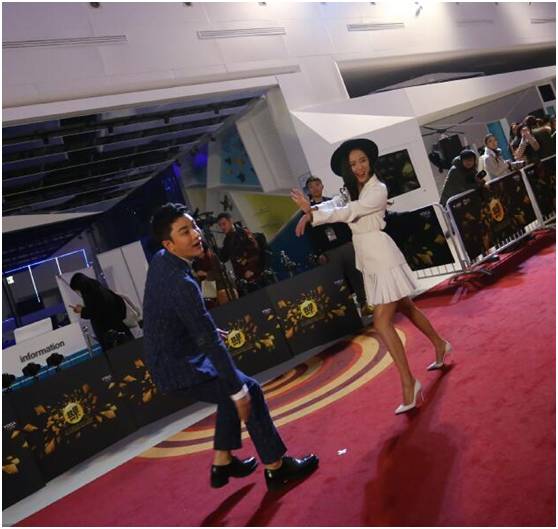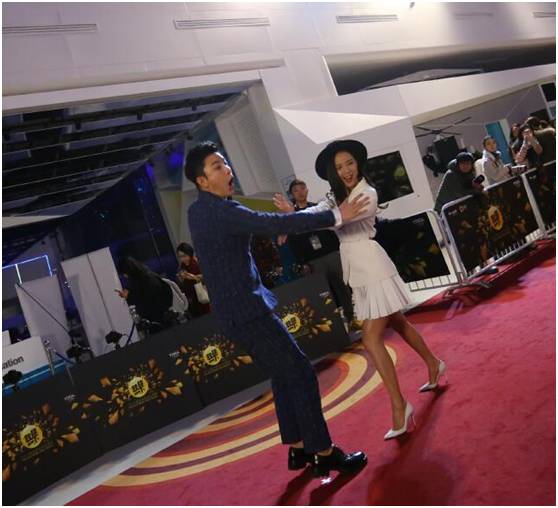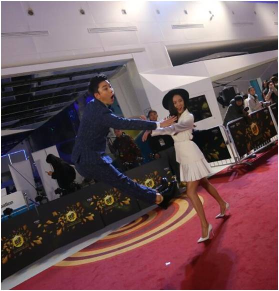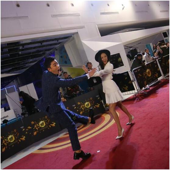 王珞丹当晚在红毯一边秀着美腿,一边在“子弹时间”区域和“神经奶爸”贾乃亮玩了起来,红毯气氛也被带动的超high!