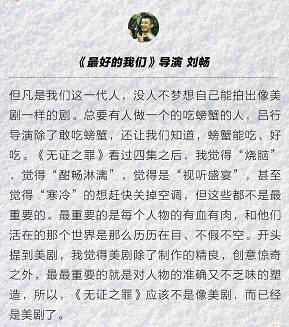 电视剧《最好的我们》的导演刘畅在看完《无证之罪》这场视听盛宴后,觉得“烧脑”、“酣畅”,“甚至冷得想赶快关掉空调”,并认为美剧的成功之处便在于有血有肉、生动准确的人物塑造。在这一点上,“《无证之罪》应该不是像美剧,而已经是美剧了。”