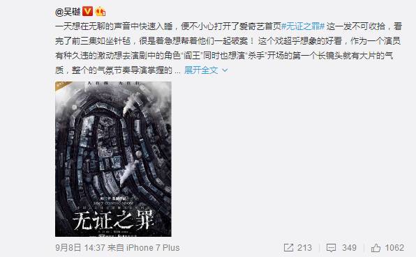 自9月6日起,网剧《无证之罪》在爱奇艺全面上线。剧集刚上线不到一周,就引来众多影视圈大佬强势关注,这种现象在国产网剧业实属头一遭。一贯惜字如金的业界大咖,却对这部悬疑、犯罪、小成本网剧《无证之罪》大加赞赏,着实让观众对此剧产生了好奇。