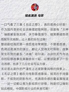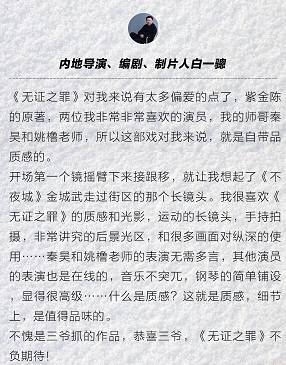 业内大咖口碑加持、鼎力相助,这在国产剧中实属罕见。除自身过硬的剧本创作外,在当今国内市场,一部网剧,居然可以汇聚这么多导演、编剧、明星,甚至CEO发自肺腑地宣传推荐,主要还是源于剧作精细的电影质感、凛冽的镜头语言、真实的氛围营造,以及震撼的演员表演。相信,经过《无证之罪》的洗礼,中国网络影视业的发展将会空前强盛。