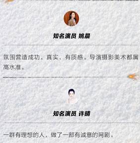 徐静蕾、许晴、吴樾等影视名人纷纷表达自己对这部作品的喜爱。许晴称赞本剧是一部“有诚意的网剧”,而吴樾更是从中看到了制作的精良与主创的用心:“剧中用了很多美式的摄影手法,而色调像极了韩国的暴力惊悚片!”这种对影视语言精心的设计与质感的突破,在之前国产小成本网剧中是很难看见的。