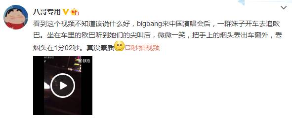 “八哥专用”微博上传这段影片,批评:“Bigbang来中国演唱会后,一群妹子开车去追欧巴。坐在车里的欧巴听到她们的尖叫后,微微一笑,把手上的烟头丢出车窗外,丢烟头在1分02秒。真没素质。”