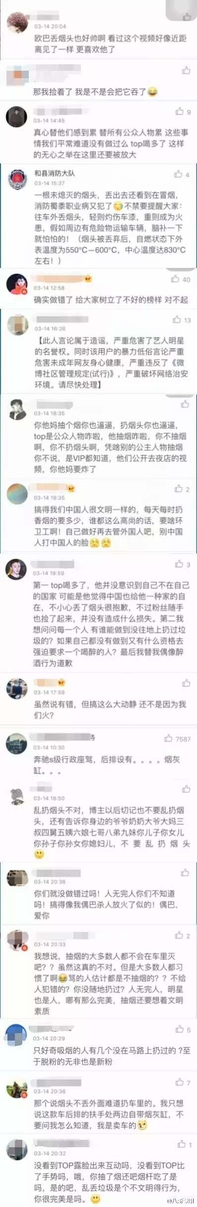 随后“八哥专用”又评论道:“本来也不想说什么了,视频清清楚楚的看到bigbang的top扔烟头。而且这部车得后座是配有烟灰缸的。一些粉丝不停道歉,不明白道歉的原因是什么?难道是你们做错了?还有一些粉丝简直就是三观不正,能说出这种话来,你真牛逼。”