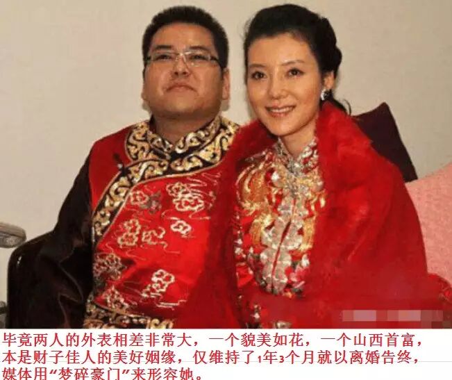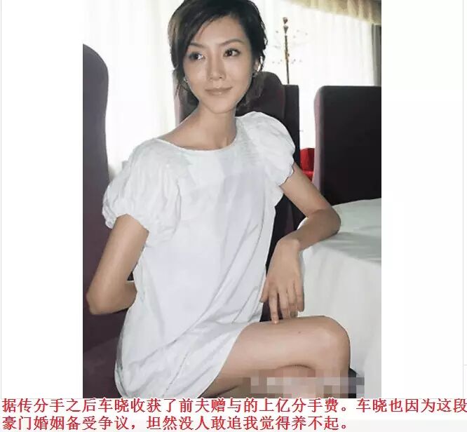 车晓在2012年,轰轰烈烈嫁给山西首富李兆会,但是这段婚姻仅仅历时1年零3个月就离婚了。并不是真正的花开花红,只是用钱买来的色彩罢了,人们的无奈,看钱办事,钱权伟大。并非自真本色彩。听说最近又找了个女明星,我不看好这段婚姻,为了钱可以和你结婚,没钱了也可以离婚。何况都破产了吃老本,花钱还是大手大脚的富二代呢。
