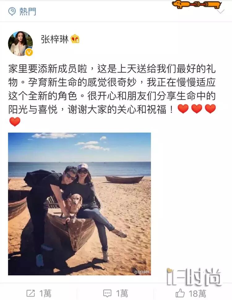 最近娱乐圈又有喜事发生,张梓琳在微博里公布自己有宝宝了!言语间满满的都是幸福,同时,张梓琳还晒出了自已与老公和爱犬的亲密合照,在碧海蓝天沙滩下,两人对着镜头笑得十分灿烂。