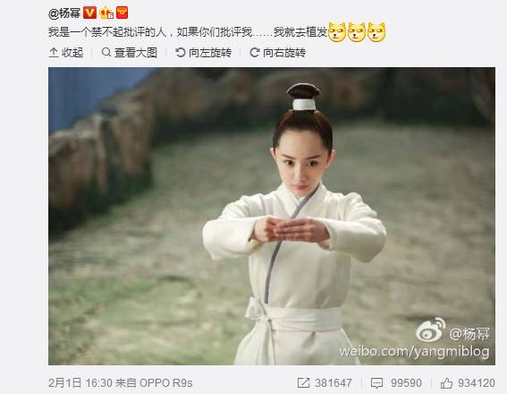 在昆仑虚拜师学艺,灵动可爱,演出了不谙世事调皮捣蛋的少女小狐仙的感觉。不过,网友的注意力(还有小编),都集中在了杨幂的发际线上。杨幂也自黑:我是一个禁不起批评的人,如果你们批评我,我就去植发。然后,就有网友热心P了大幂幂幂植发后的样子,或者用“我是一个禁不起批评的人,如果你们批评我,我就......”造句。