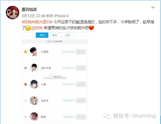 截止到5月16日11点,陈晓以四千多万的步数暂居排行榜第六位。相信有如此死忠粉的支持,陈晓的成绩也会越来越好;我们也祝福陈晓的这位死忠粉脚上的泡能早日消肿,健康快乐的支持自己喜欢的偶像。