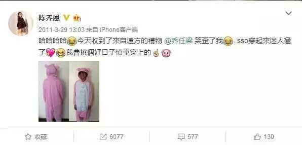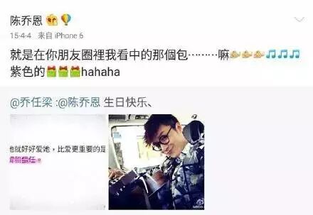 乔恩生日,乔任梁发微博祝福, 乔恩问他要朋友圈中的包,这个片段真的好有爱~
