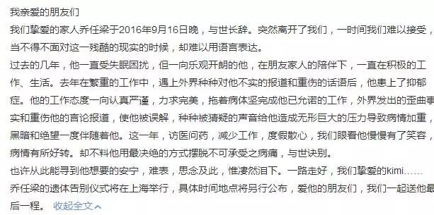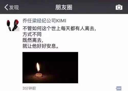 但就在大家还等着官方辟谣的时候,乔任梁经纪人发表悼念证实了传闻。