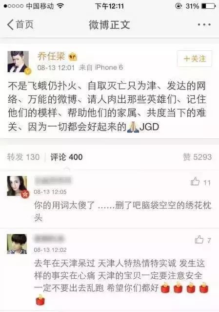 据网友分析,先是“天津爆炸”那次,乔任梁发博说“飞蛾扑火”,其实他想表达的意思是别让消防员再去做着无谓的牺牲,火太大,结果却招来骂声一片,诅咒声一片。(但他其实给消防队捐了100万)