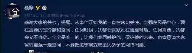 后面,徐铮被迫回应,表示自己不想公开发言是不想这事演变成网络闹剧,希望大家能给宝强空间,自己更愿意在私下给宝强提供实质性的帮助。