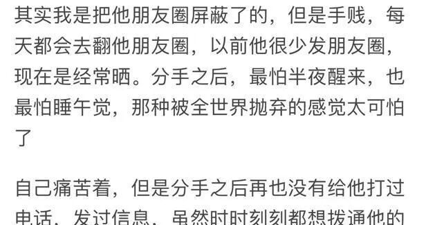 还有人说自己把他的朋友圈屏蔽了,但是却忍不住翻看,分手后最害怕半夜醒来,最害怕睡午觉,因为那种被世界抛弃的感觉真的是太可拍了,而自己能做到的极限只是想要拨通对方的电话而已
