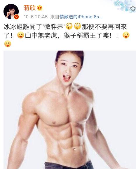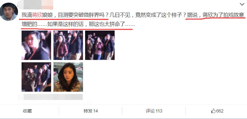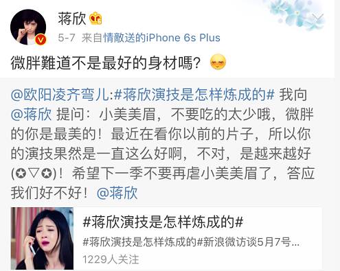 虽然在我印象中,蒋欣无时不刻都在强调微胖健康的理念↓