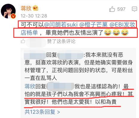 对于网友的调侃,蒋欣显得十分大度,并强调不要掀起骂战,“以和为贵”。