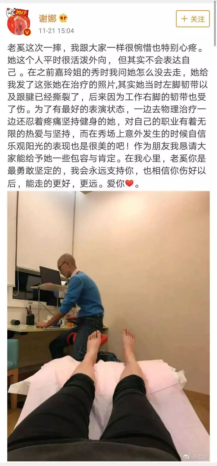 谢娜还发了很长的文说奚梦瑶左脚韧带受伤,跟腱撕裂,右脚也受伤了,一边忍着疼痛,一边健身。