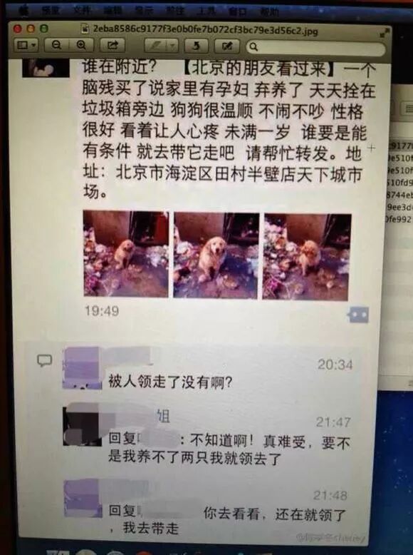 大概是在2014年的时候,有一条帖子转的特别火,说是狗狗被遗弃在垃圾桶旁,还给出了地址。