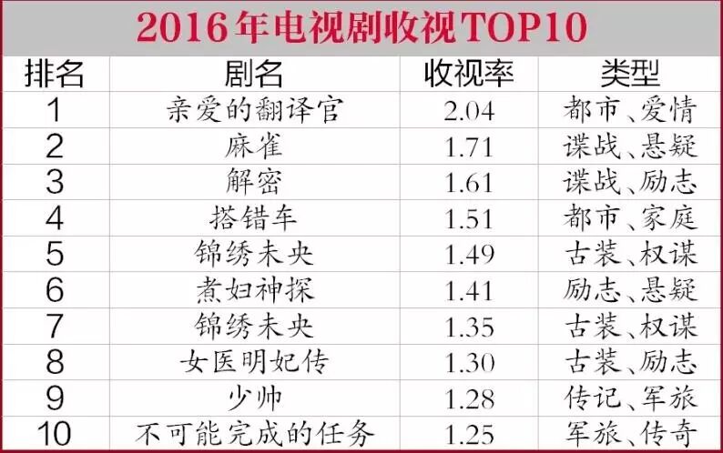2016年的电视剧市场喜忧参半,截至2016年11月30日,国内省级卫视黄金档和周播剧场共播出了187部电视剧,较去年减少26部,其中有29部收视率破1。通过2016年电视剧收视率TOP50可以看出,目前市场上的国产电视剧共涉及了13种题材,言情占12部,都市生活8部,古装传奇7部,社会伦理7部,反特/谍战5部。值得一提的是,都市题材去年在众多题材中异军突起,《欢乐颂》、《小别离》、《好先生》等剧的口碑都超过同期其他题材。