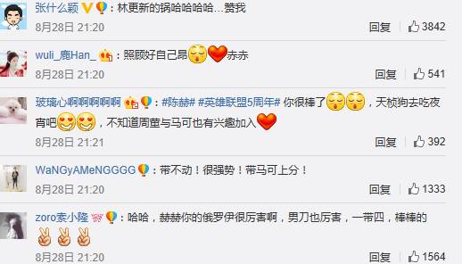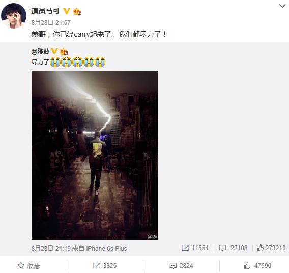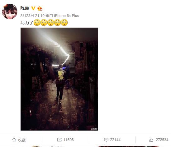 8月28日晚,陈赫通过微博晒生背双肩包的背影照,并做大哭状称:“尽力了!”对此,网友也纷纷留言鼓励并安慰,称:“没事儿,你打的很好了!”“队友菜不是你的错!”“只怪林狗太怂。”