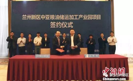 1月11日,兰州新区中亚粮油储运加工产业园项目签约仪式在宁卧庄宾馆举行。市委常委、新区党工委书记杨建忠,管委会主任牛向东,副主任何静,亚上农业发展有限公司董事长刘京平参加签约仪式。