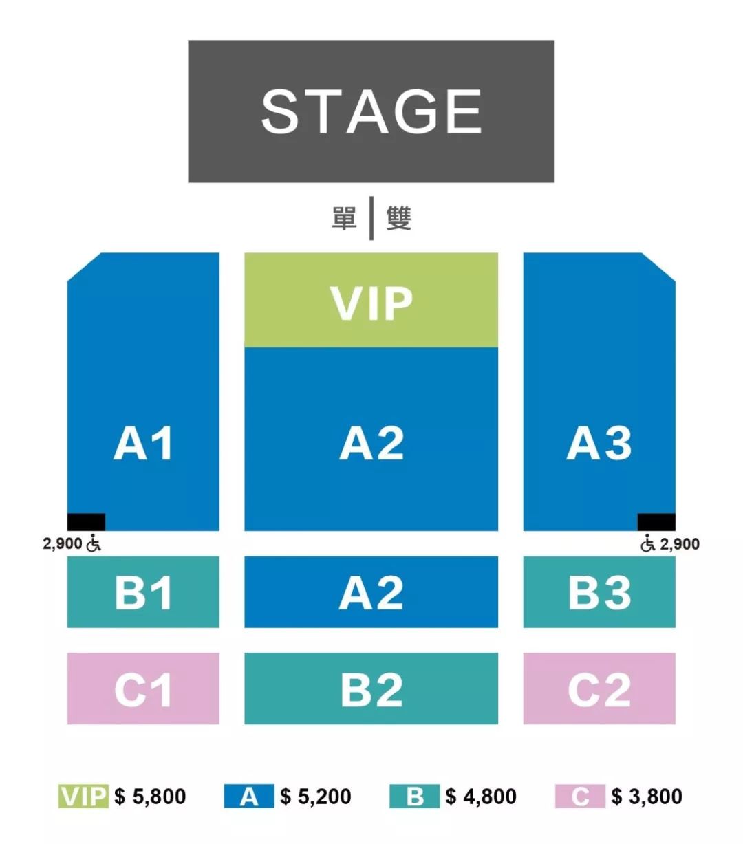 VIP区 NT$5,800/ A区 NT$5,200/ B区 NT$4,800/ C区 NT$3,800/轮椅席/2900(全区座席,对号入座。)