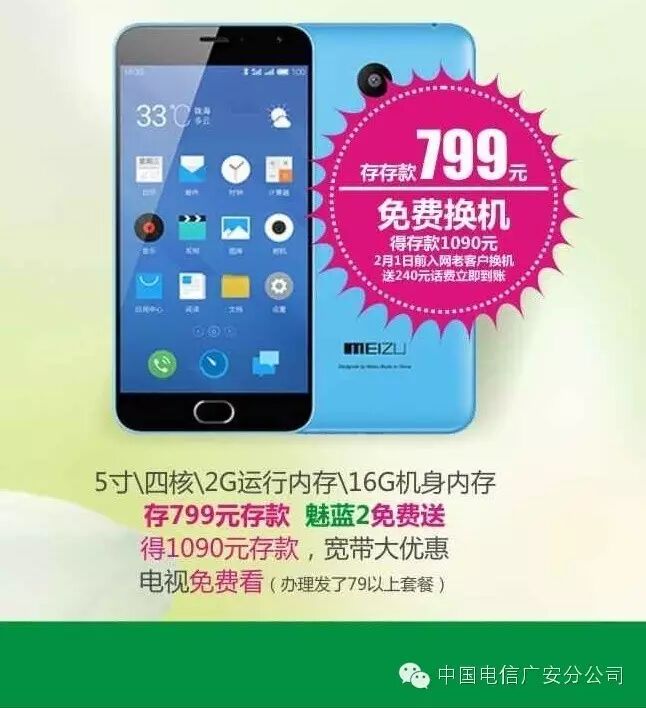 3、存799元存款,得价值1090元的魅蓝2手机(2G+16G),得1090元存款,老用户换机,再得240元立即到帐话费,太划算!数量有限, 去广安市内各城区主厅抢购吧!