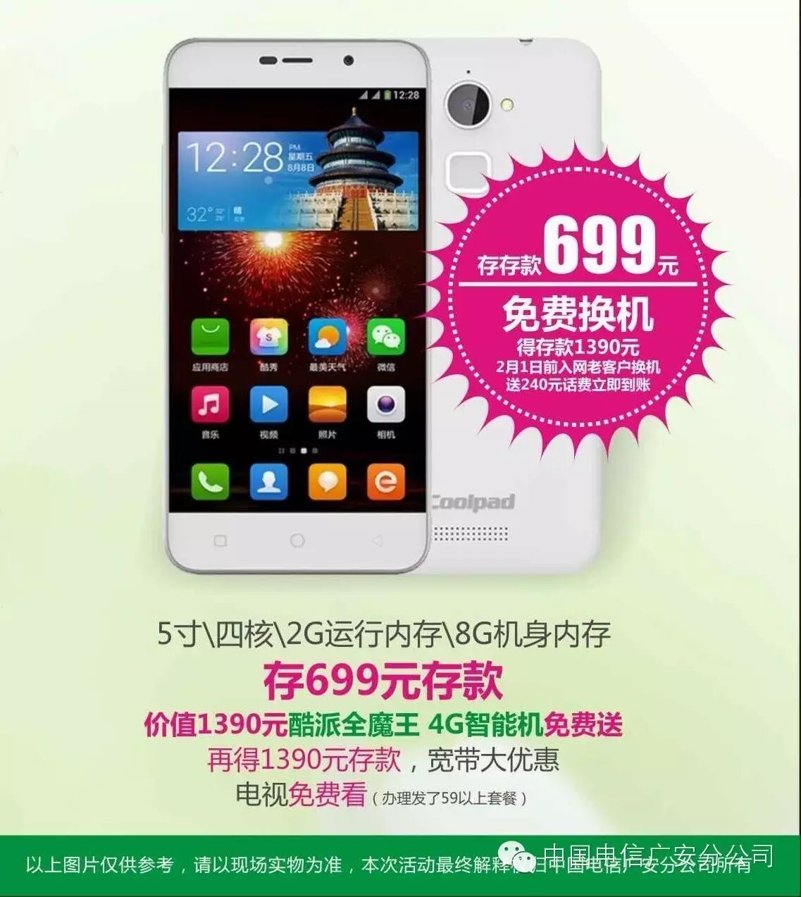 2、存699元存款,得价值1390元的酷派全魔王4G手机(2G+8G,全网通3.0,三网手机卡混插,三网可以上4G),得1390元存款,老用户换机,再得240元立即到帐话费,绝对是千值万值! 数量有限, 去广安市内各城区主厅抢购吧!