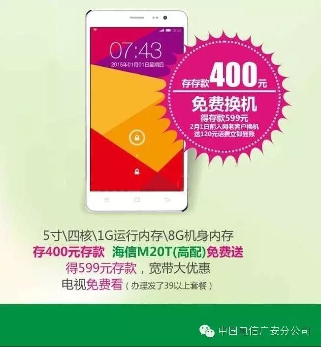 1、存400元存款,得价值599元的海信M20T高配(1G+8G),得599元存款,老用户换机,再得120元立即到帐话费,太值啦!这样的优惠千载难逢!!活动地点:各城区主厅。