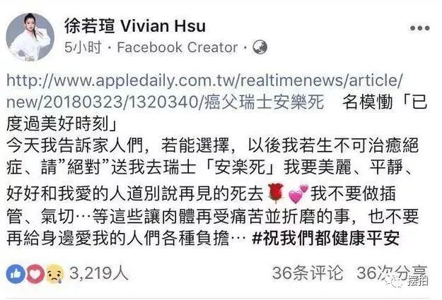 前不久,徐若瑄在自己的社交平台上突然更新了动态称:如果未来自己患上了无法治愈的绝症,希望家人能让她自己选择,不要让她痛苦折磨的垂死挣扎,一定要送她去瑞士进行“安乐死”,她希望自己能美丽平静的死去,不给身边的爱人们增添负担。在文章的最后,徐若瑄也是祝愿大家都能够健康平安。相信看到徐若瑄的这条动态的朋友们,一定也是感慨万千吧。
