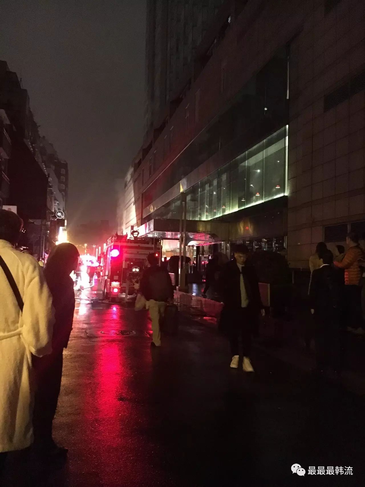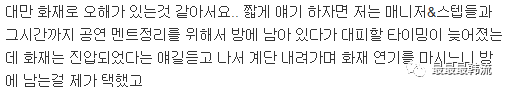 当时我和我的经纪人还有工作人员一起,为了整理关于演唱会的内容在房间里留到那个时间,错过了逃生的时机,听到火灾已经控制了的消息才下了楼梯时候,稍微吸到了一点残留的烟味。是我选择留在房间的。