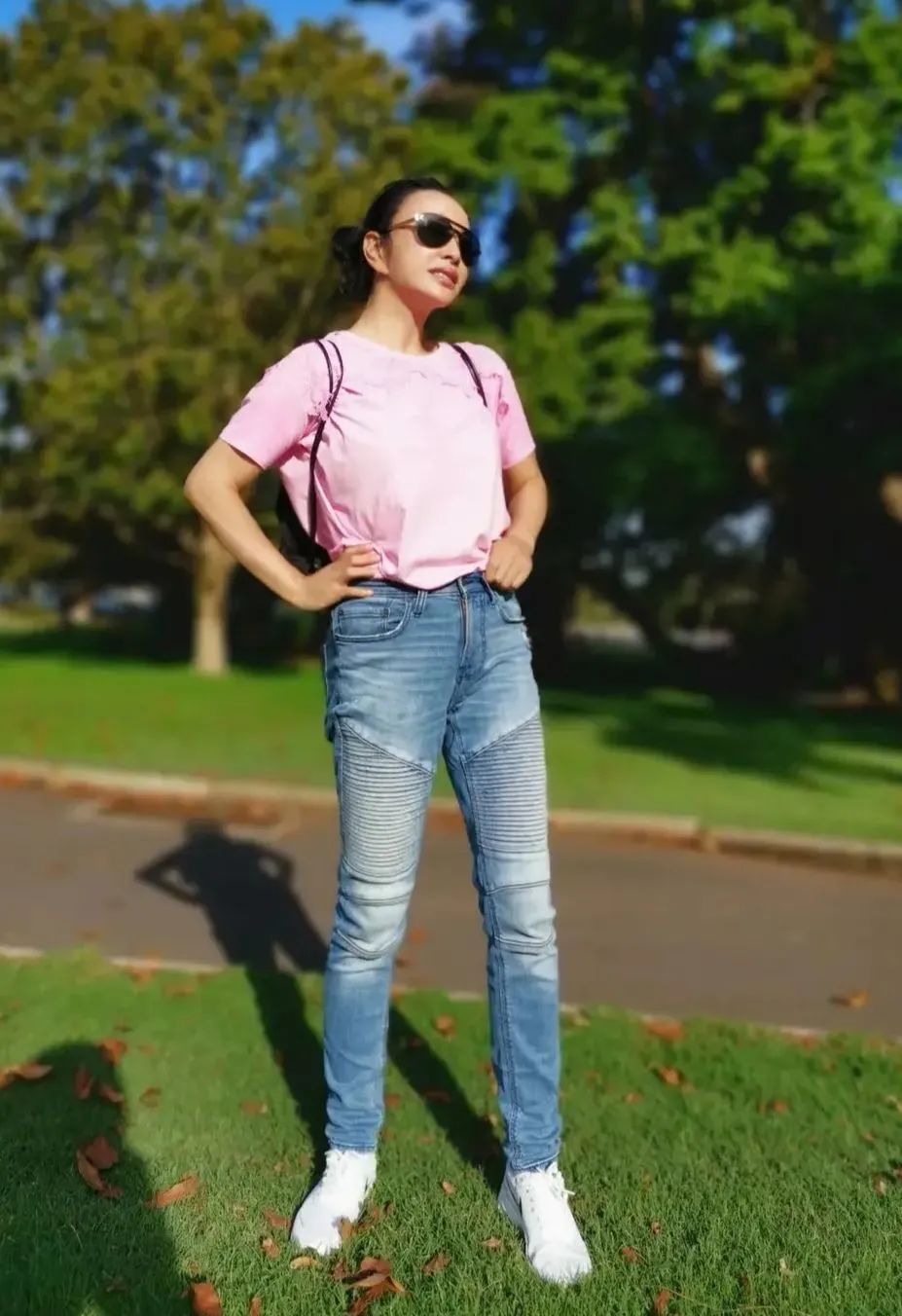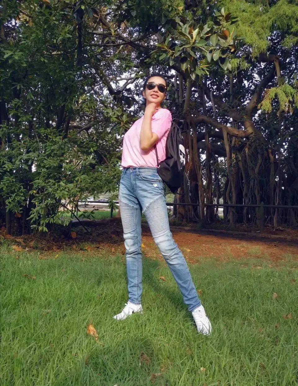 刘晓庆上面穿的是一件短袖,因为现在的天气还是比较热的,所以大家身上穿的衣服看起来都会显得比较的清爽,上面这件短袖选择的颜色是粉红色。下面搭配的是一条蓝色的牛仔裤,并且是那种浅浅的蓝色,没想到下面的那一双腿看起来这么苗条,就像是少女的腿一样,所以显得还是有一点点不太真实呢。