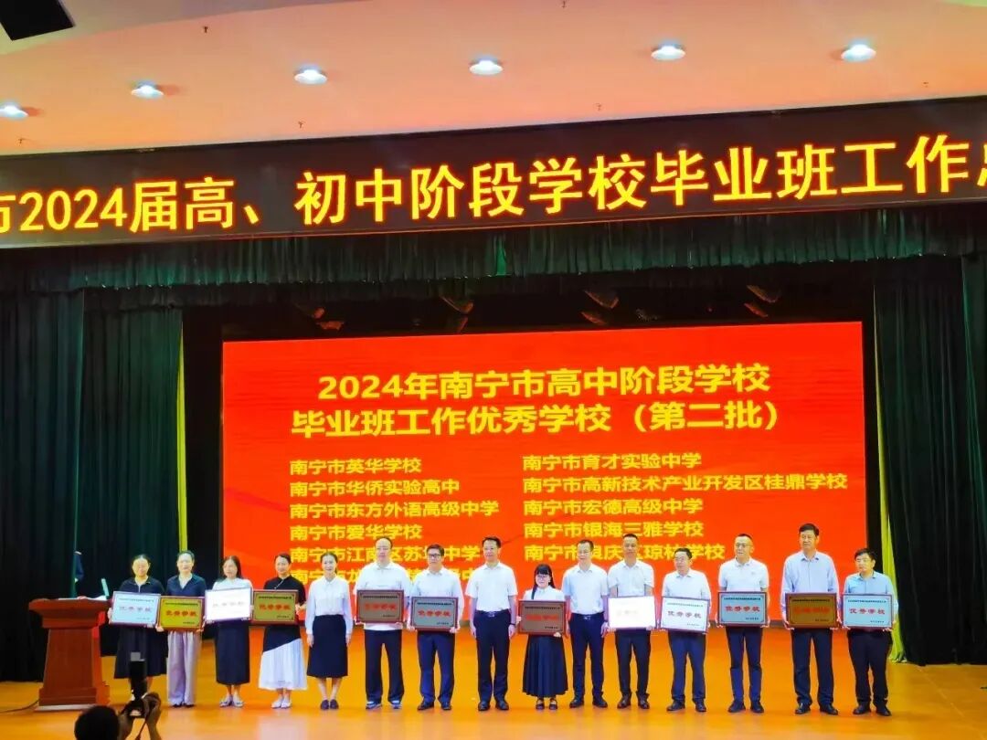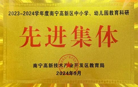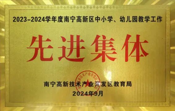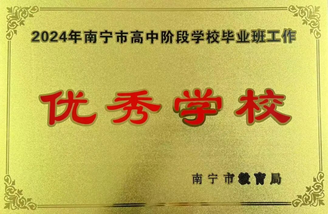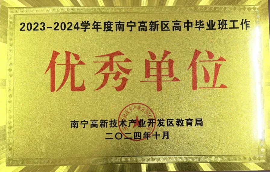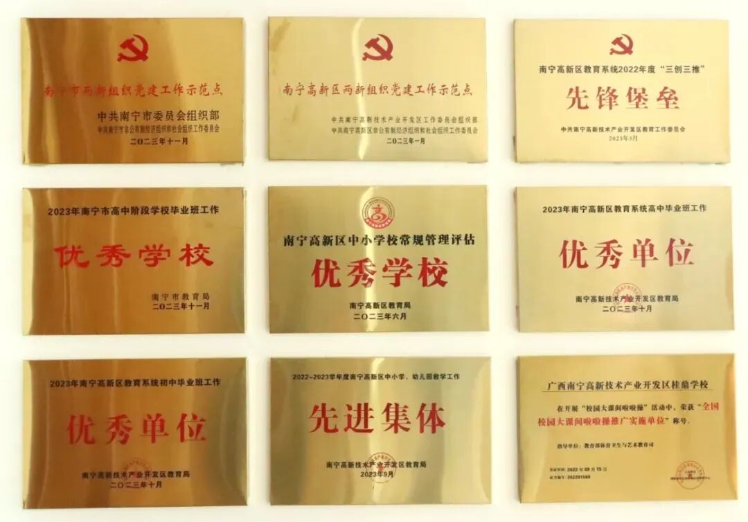 近年来学校评为“高新区中小学常规管理优秀学校”,连年荣获“南宁市高中阶段学校毕业班工作优秀学校”“南宁高新区高中毕业工作优秀单位”“南宁高新区中小学教学工作先进集体”“南宁高新区中小学教育科研先进集体”“全国校园大课间啦啦操推广实施单位”等荣誉称号。